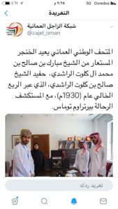 الشيخ مبارك بن صالح بن كلوت الراشدي يسترجع خنجر جده الشيخ صالح بن كلوت الراشدي من المتحف الوطني العماني سبتمبر 11, 2018 Posted by: Author mashrf Category: التعليقات على الشيخ مبارك بن صالح بن كلوت الراشدي يسترجع خنجر جده الشيخ صالح بن كلوت الراشدي من المتحف الوطني العماني مغلقة
